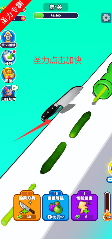 连击与特殊道具:连续准确切割可激活连击模式,获得额外分数加成;游戏中还设有加速、减速等道具,辅助玩家提升效率或应对高难度关卡。