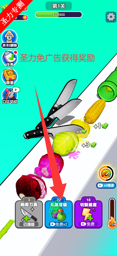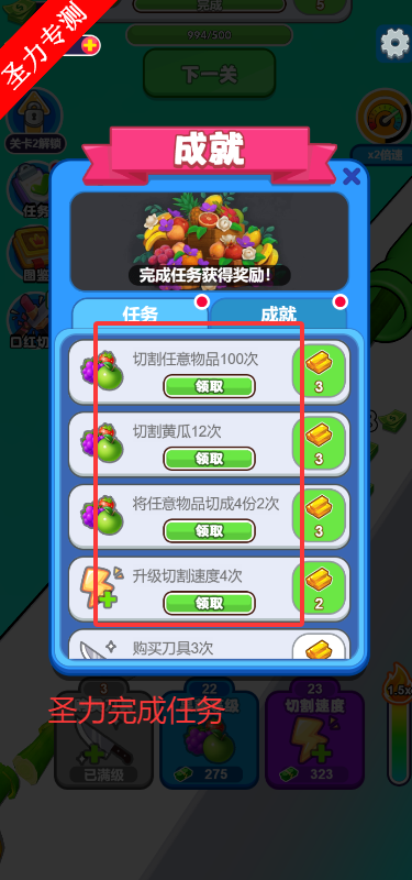任务与成就系统:完成特定任务(如限时切割、指定食材组合)可解锁成就,获得金币奖励,用于升级刀具或购买新皮肤。