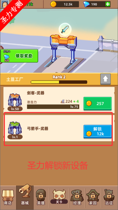 建造与升级生产线:玩家需规划工厂布局,建造英雄装备生产线(如武器锻造、防具缝制车间),并通过升级设备提升生产效率,解锁更高级的英雄部件。