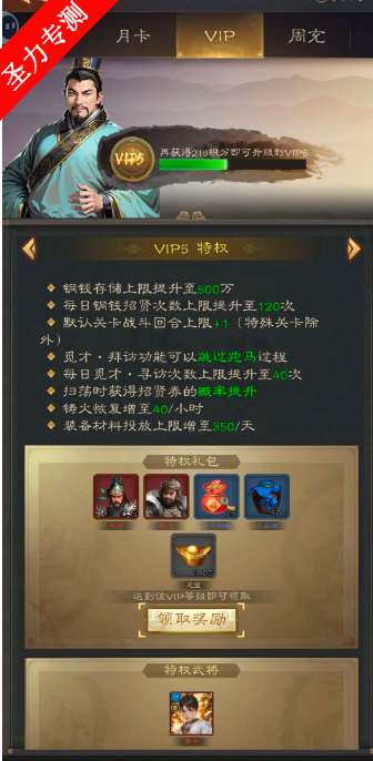4.继续发福利(有一定条件),到V5,领取vip礼包:张飞+关羽。