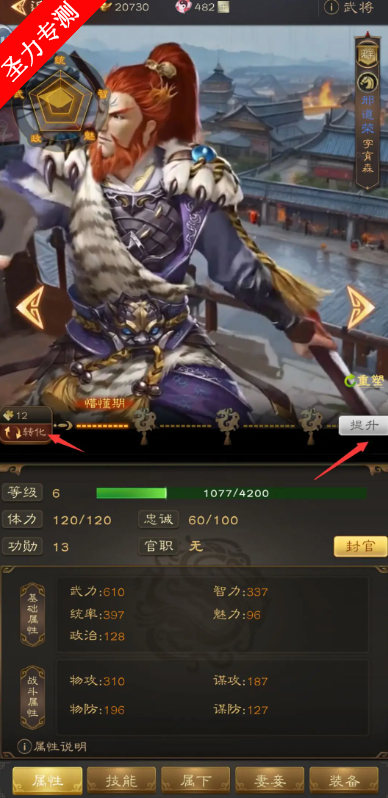 3.技能升级:通过铜币分解武将获得技能点,技能升级能提高技能伤害系数;