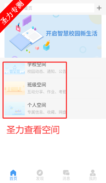 1、进入软件,可以打开学校空间等功能