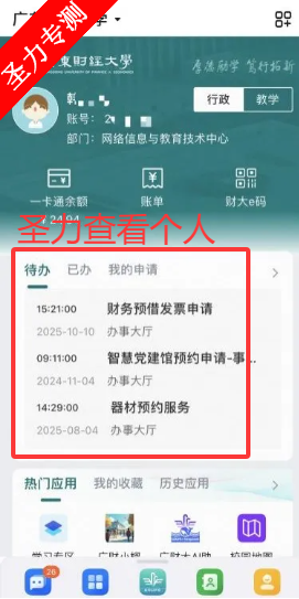 广财通APP作为数字广财核心应用,整合校园通知、请假、报销、科研申报等流程,提供实名通讯录、群事务管理、AI智能问答等服务。师生通过一个入口即可完成学习、生活、行政事务,告别多系统切换,提升校园办事效率。